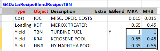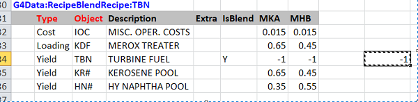 Suppose you have been using the original default sign convention for recipe blends in your model. The operations would look like this, if you exported them to an SSI (or if you entered them in TABLE 4**.2). The Turbine Fuel (TBN) which is the blend that is made has a negative sign, while the two inputs are positive.