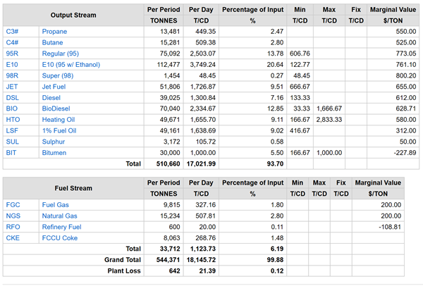 There are some models where the overall loss is taken off right at the beginning. In the model of the main distillation towers something like 1.05 tons of feed comes out as 1 ton of product. This is a convenient way of taking into account a typical observed loss without assigning it to a specific activity. A few models use the blend factors as well, but these are not common. Models with transportation options sometimes use the loss factors – sometimes not.